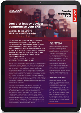 The Brocade 300 (Lenovo B300) and Brocade 6505 (Lenovo B6505) switches are long past their Fabric OS® End-of-Availability dates – meaning no new features, no security patches, and increasing risk of downtime. As workloads grow and modern servers and storage demand higher performance, these legacy devices create bottlenecks, compatibility issues, and rising vulnerability across your SAN.